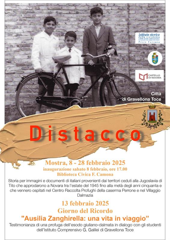 In occasione del Giorno del Ricordo che ricorre il 10 Febbraio, Sabato 8 febbraio 2025 alle ore 17:00 presso la Biblioteca Civica "F. Camona" di Gravellona Toce si terrà l'inaugurazione della mostra "Distacco", storia per immagini e documenti di italiani provenienti dai territori ceduti alla Jugoslavia di Tito che approdarono a Novara tra l'estate del 1945 fino alla metà degli anni cinquanta e che vennero ospitati nel Centro Raccolta Profughi della caserma Perrone e nel Villaggio Dalmazia.