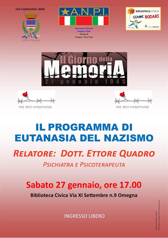 In occasione della Giornata internazionale della memoria dell’Olocausto, la Biblioteca di Omegna e la locale sezione di ANPI propongono un incontro con il dott. Ettore Quadro per riflettere sul programma di soppressione di persone con disabilità mentali o affette da malattie genetiche inguaribili portato avanti dal Nazismo.