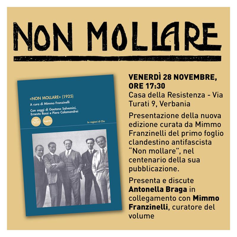 Venerdì 28 novembre, alle ore 17:30, alla Casa della Resistenza si terrà la presentazione della nuova edizione curata di Mimmo Franzinelli del primo foglio clandestino antifascista «Non Mollare» (1925) nel centenario della sua nascita e ripubblicato nel 2025 da Pacini Editore.