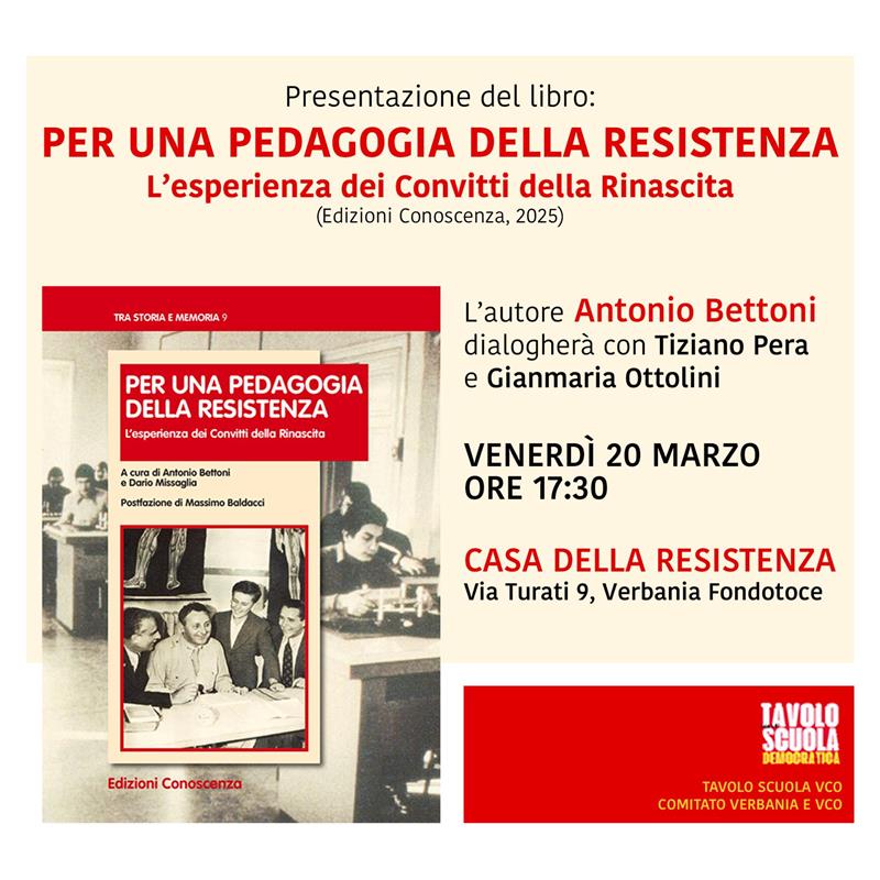 Antonio Bettoni (Associazione Proteo Fare Sapere) presenterà il volume Per una pedagogia della Resistenza. L'esperienza dei convitti della Rinascita (Edizioni conoscenza, 2025) venerdì 20 marzo, ore 17:30, alla Casa della Resistenza.