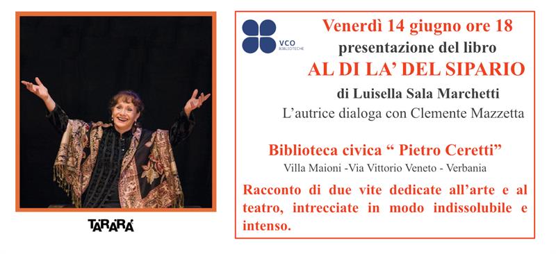 Venerdì 14 giugno alle ore 18.00 alla Biblioteca di Verbania ci sarà la presentazione del libro: "Al di là del sipario, una storia di vita di palcoscenico d'arte" di Luisella Sala Marchetti. L'autrice sarà in dialogo con Clemente Mazzetta.