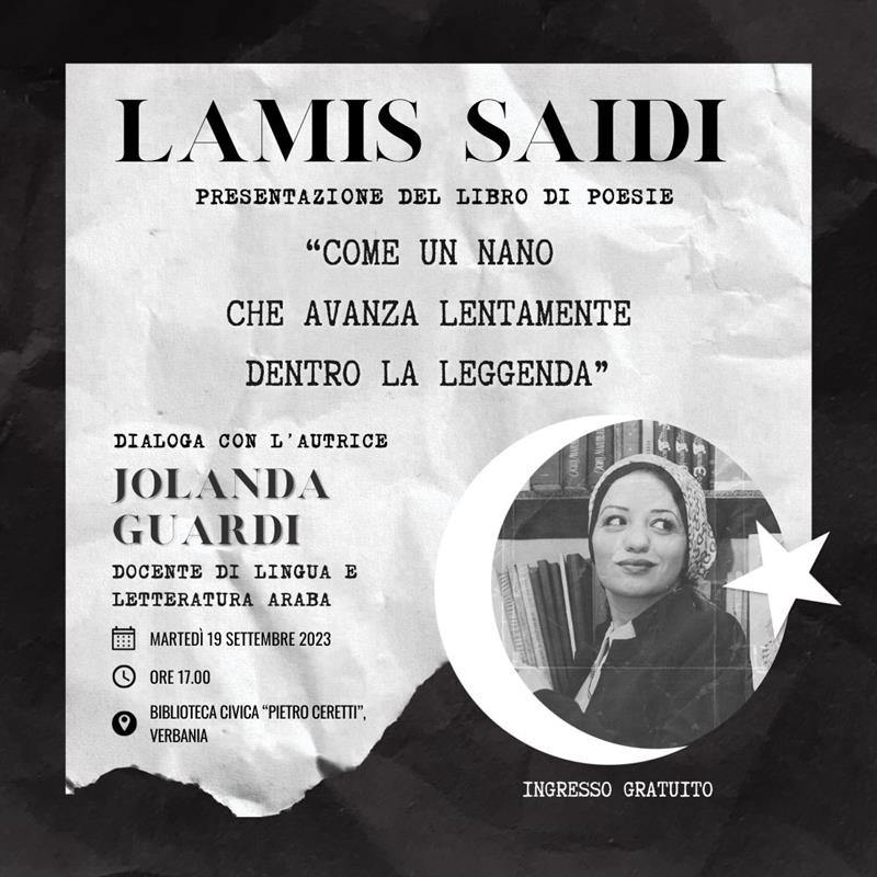 Sono alcuni versi tratti da “Come un nano che avanza lentamente nella leggenda”, opera della poetessa Lamis Saidi che presenterà il suo ultimo libro. Dialogherà con lei Jolanda Guardi, docente di letteratura e lingua araba.