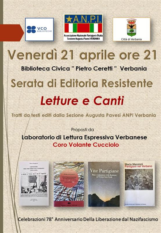 ANPI Verbania, in collaborazione con il Comune di Verbania e la Biblioteca "P. Ceretti" di Verbania, organizza, in occasione delle celebrazioni per il 25 Aprile, una serata di letture e canti tratti da libri editi dalla sezione Augusta Pavesi, che narrano di fatti persone e luoghi, noti e meno noti, che hanno caratterizzato la lotta di liberazione sul nostro territorio.