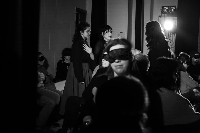 Si tratta infatti di una performance sensoriale a cui un numero ridotto di spettatori assiste bendato e seduto al centro dello spazio scenico,