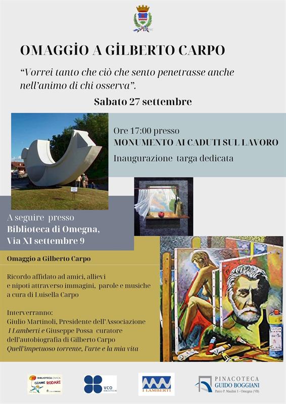 Omegna rende omaggio a Gilberto Carpo con lo svelamento di una targa presso il Monumento ai caduti sul lavoro e con un incontro coordinato da Luisella Carpo presso la Biblioteca civica Rodari durante il quale interverranno Giulio Martinoli dell'Associazione I Lamberti e Giuseppe Possa, curatore dell'autobiografia di Carpo Quell'impetuoso Torrente.